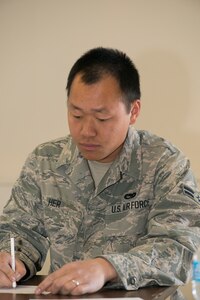 Members of the 366th Fighter Wing processed through a simulated deployment line in preparation for a weeklong exercise, April 14. Creating a smooth in-processing line is an important part for deploying combat-ready Airmen, and protecting resources. After Airmen fill out paperwork with the Military