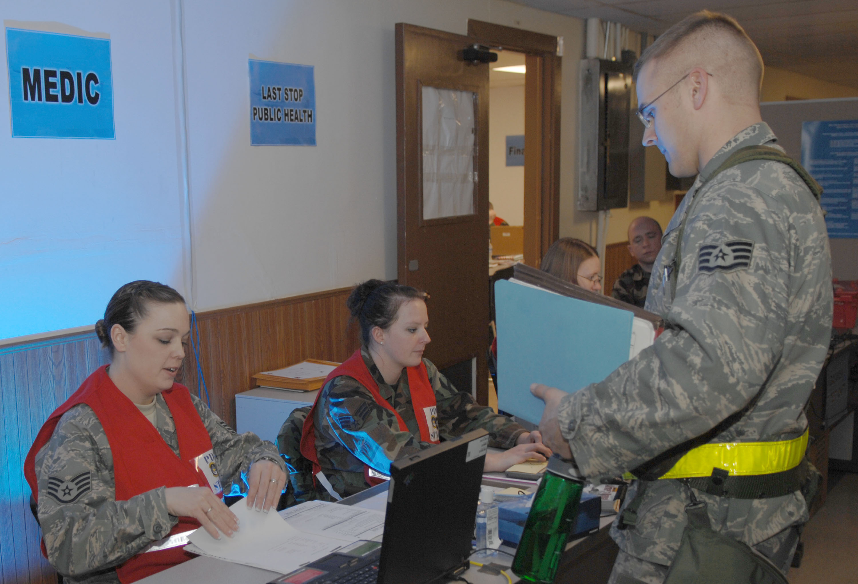 PDF line ensures deploying Airmen prepared for fight Published March 14, 2008 By Staff Sgt. Rodney D. Ivey 366th Fighter Wing Public Affairs Office MOUNTAIN HOME AIR FORCE BASE, Idaho -- The 366th Fighter Wing's personnel deployment function line played a critical role during Exercise Coronet White 08-ACC-14 ensuring every Gunfighter sent out the door was fully prepared to support operations downrange. The PDF line is manned by personnel from the 366th Logistics Readiness Squadron, intelligence flight, mission support squadron, legal office, finance office, Airmen and Family Readiness Center, chapel and medical group. "The main reason we're here is to make sure deploying Airmen are eligible to deploy and completely ready to go," said Maj. Rosalind Abdulkhalik, 366th Military Personnel Flight commander. "We're the last set of eyes to verify everything before they leave." The PDF line ensures Airmen are eligible in multiple areas, including medical qualifications, general training and weapons proficiency. If someone isn't eligible, their unit must provide a replacement. It took a well organized system to successfully process 800 personnel during the Phase I of the exercise, Mar. 14 and 15. Anywhere between two to more than 60 people processed during each of the dozen "chalks" or groups during the Phase I. To manage and synchronize the process timing of every chalk, the Deployment Control Center established strict timelines to make things flow smoothly. "The Deployment Control Center serves as the hub for all wing deployment functions," said Capt. Lauren Hodges, Installation Deployment Officer. "We look at what is tasked, develop a schedule of events to process passengers and cargo in a timely manner in order to get them to their deployed location by the required delivery date." PDF line technicians must then work to complete each chalk within the set time. Every chalk is assigned a troop commander who receives a printout listing his responsibilities throughout the process. Troop commanders serve as the leader of the group to ensure accountability of all personnel and equipment as they travel to the deployed location. Once times are set for each chalk, UDMs receive the information from the DCC and alert personnel of their show times for processing. Before sending them over, they then check everyone's gear and ensure they have all necessary paperwork completed to get through the line. Processing begins at the community activities center where Airmen receive an anti-hijacking and prohibited items briefing. After processing their respective cargo, they are bussed to the PDF line, located in a building close to the flight line, to receive more briefings and go through their mobility folders to make sure everything is in order. Airmen then have the opportunity to make last-minute arrangements with the finance or legal office, talk with a chaplain about any personal concerns they may have and speak with a public affairs representative about interacting with media in the deployed location. Once Airmen have proven their eligibility and taken care of personal issues, they join other deploying troops to board the plane. As the Airmen shuffle out the door, the dedicated personnel of the PDF prepare for yet another group on their way to war.