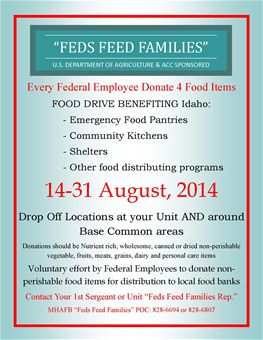 "Feds Feed Families" Food Drive 2014 Campaign concludes Published Aug. 25, 2014 By Staff Report 366th Fighter Wing Public Affairs MOUNTAIN HOME AIR FORCE BASE, Idaho -- The sixth annual "Feds Feed Families" Food Drive 2014 Campaign concludes Aug. 31, 2014. In the final week the USDA is again requesting the Department's support of the drive by donating non-perishable items. The "Feds Feed Families" campaign is a voluntary effort undertaken by Federal employees to bring non-perishable food items to their offices for distribution to local food banks. During the 2013 food drive was overwhelmingly successful. Food donations across the Federal government totaled nine million pounds of food items. The Department of Defense alone contributed over 1.9 million pounds of food. All food donated from Mountain Home Air Force Base will contribute to local food banks in Southern Idaho, which in return serves food pantries, senior centers, rescue missions, community kitchens and other feeding programs. "Feds Feed Families" allows us to showcase how caring and giving our people are and demonstrates our commitment as a Department to helping people in need. Mountain Home Air Force Base hosts multiple donation drop off locations throughout the base, to include the commissary, Base Exchange, the 366th Medical Group and the Gunfighter Fitness Center.